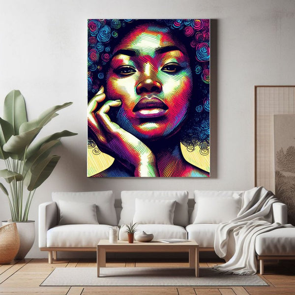 Explorez la Beauté des Antilles avec notre Tableau sur Toile "Énergie Solaire : Représentation Colorée d'une Femme Antillaise"