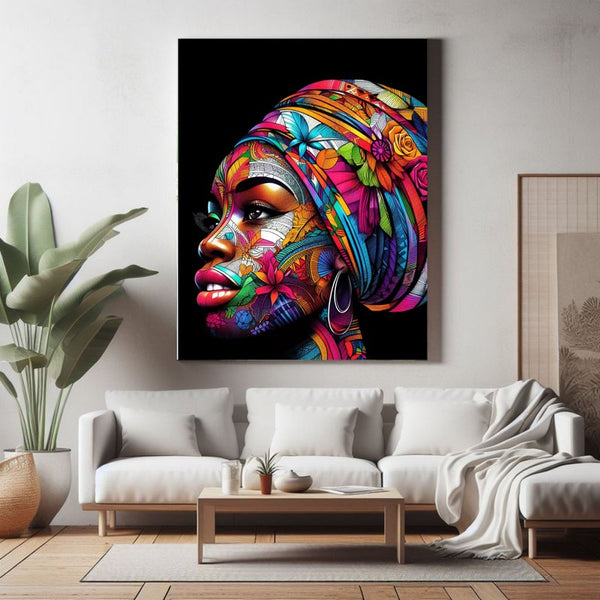 Explorez la Beauté des Antilles avec notre Tableau sur Toile "Éveil des Sens : Femme Antillaise dans une Explosion de Couleurs"