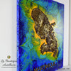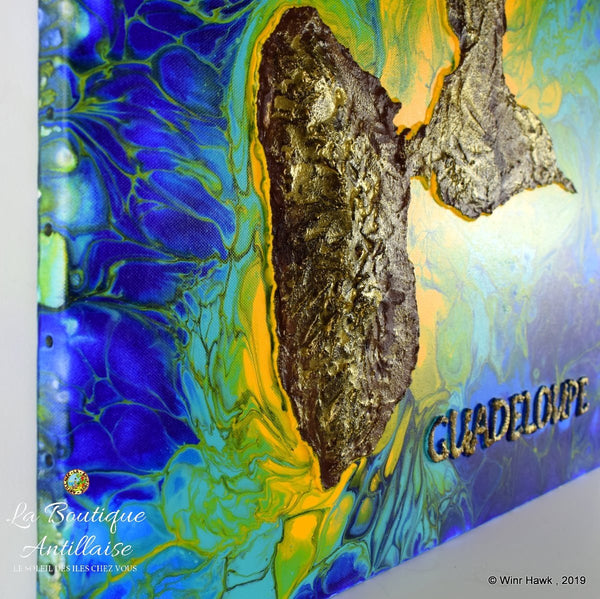 Tableau de la Guadeloupe, décoration Antillaise L’île de la Guadeloupe entourée par les nuances de bleus de la mer des Caraïbes et de l’océan Atlantique.